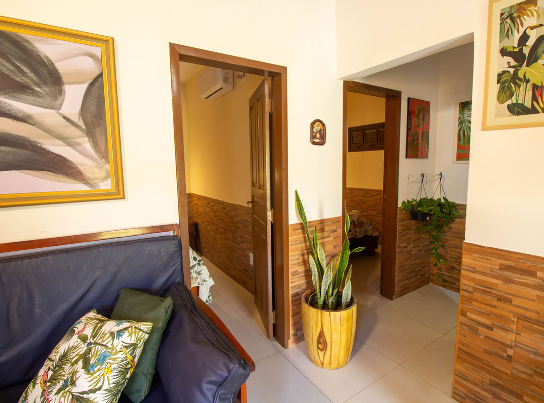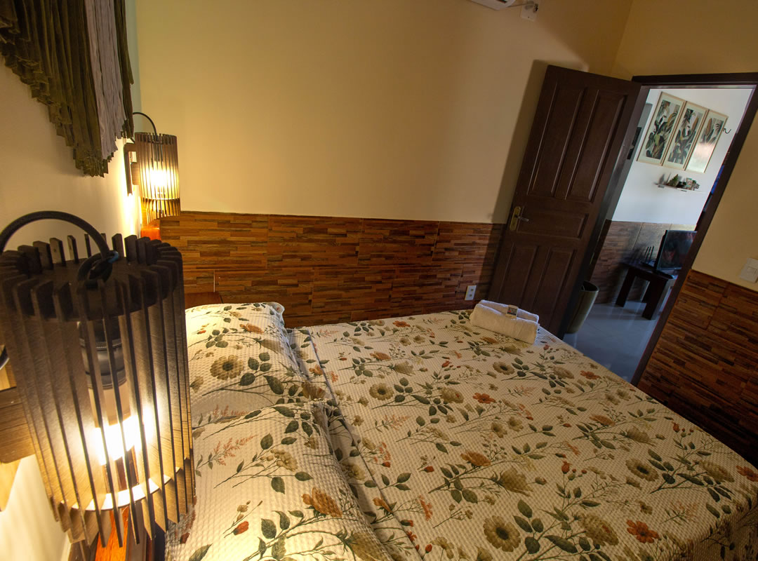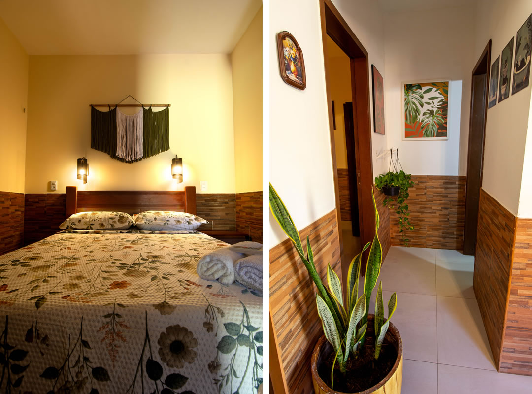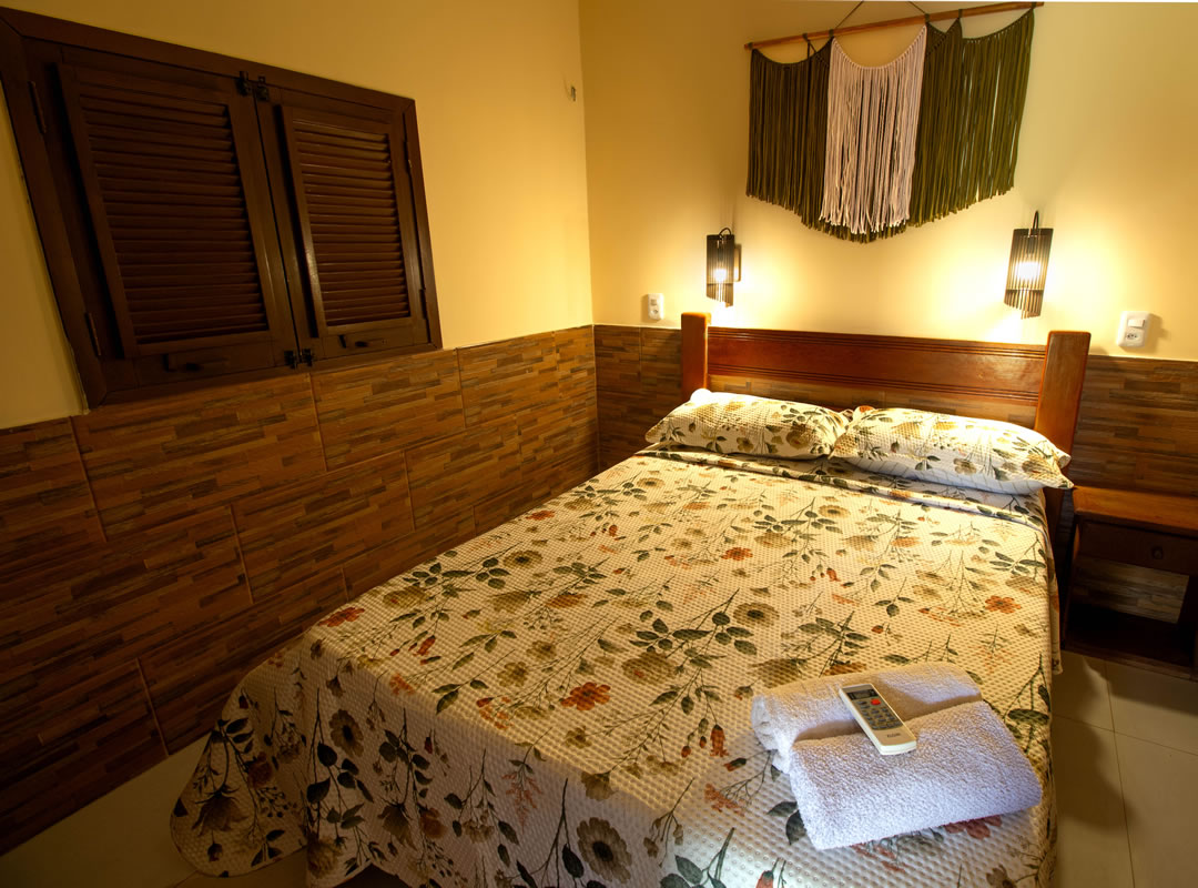 A casa contém 2 quartos, ambos com ar condicionado, 2 camas de casal, 4 colchões de solteiro e armadores para estender rede 4 redes.