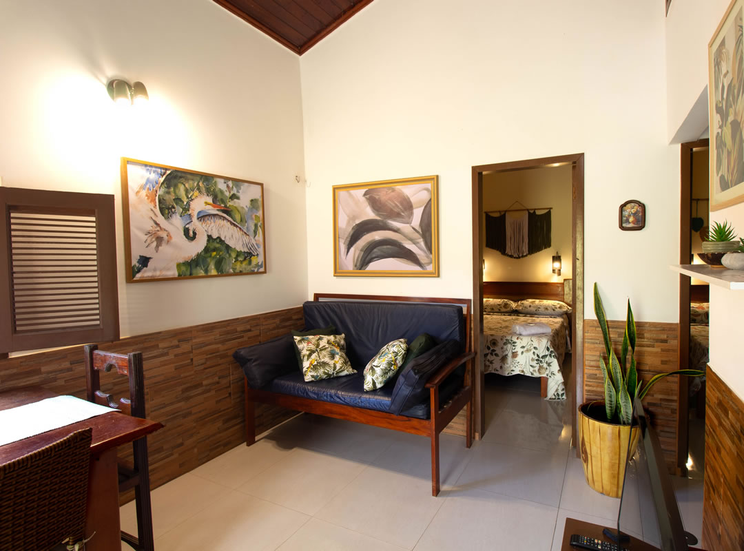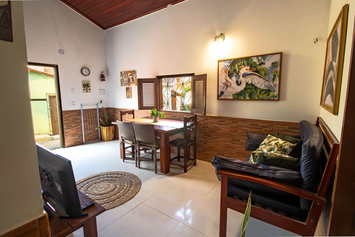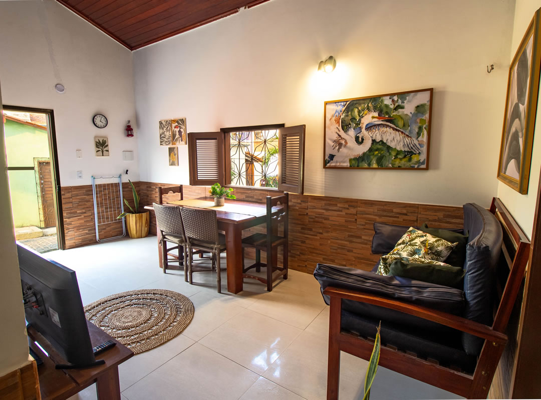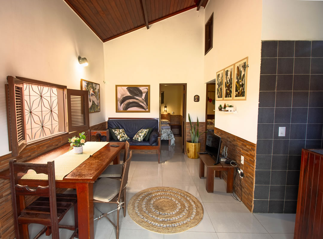 -Há uma sala de estar com sofá e mesa para refeições, uma cozinha completa com utensilios, fogão e geladeira, tv smart e um banheiro privativo.